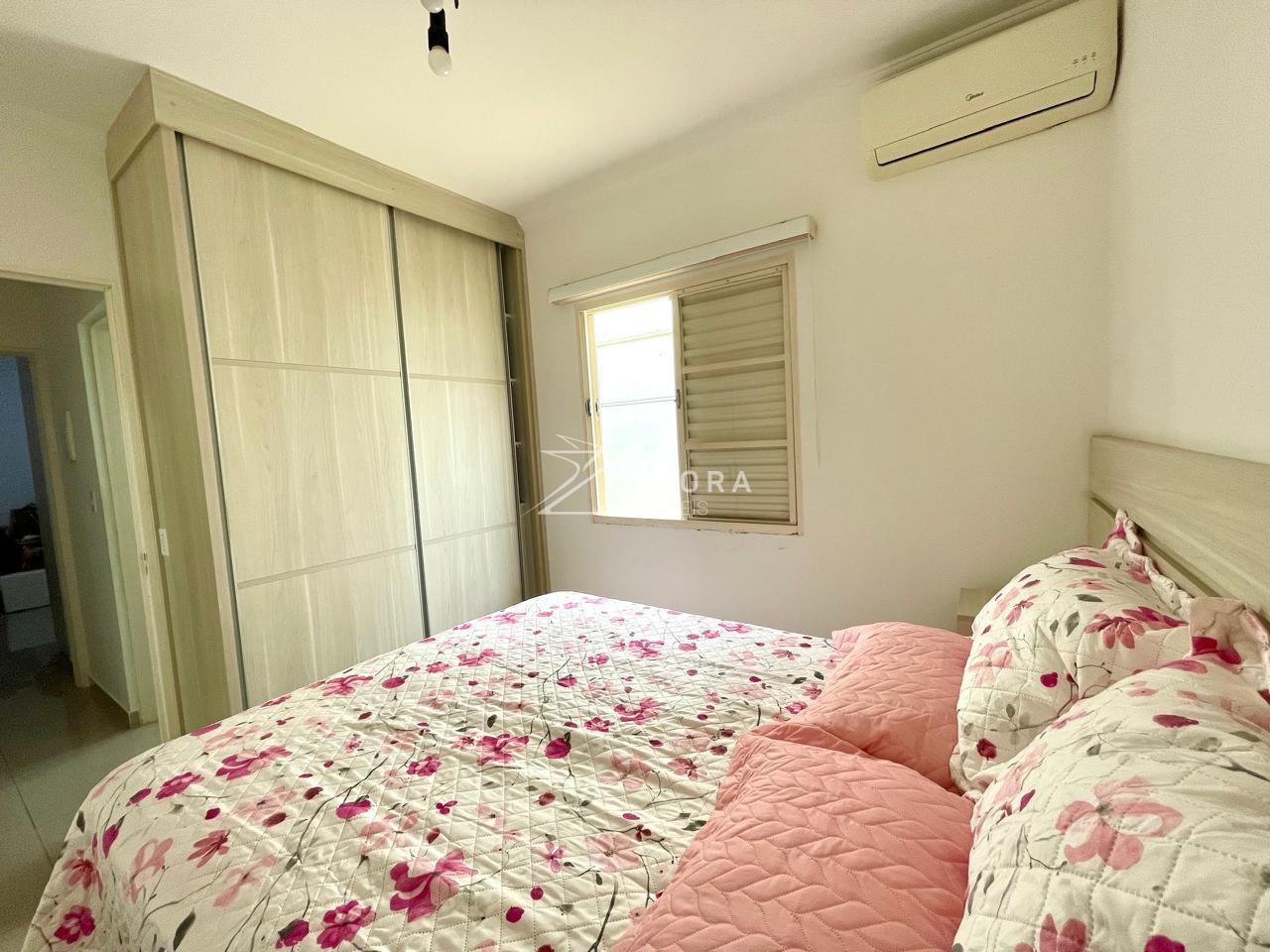 1 dos quartos com cabeceira para cama, ar condicionado e armário planejado.