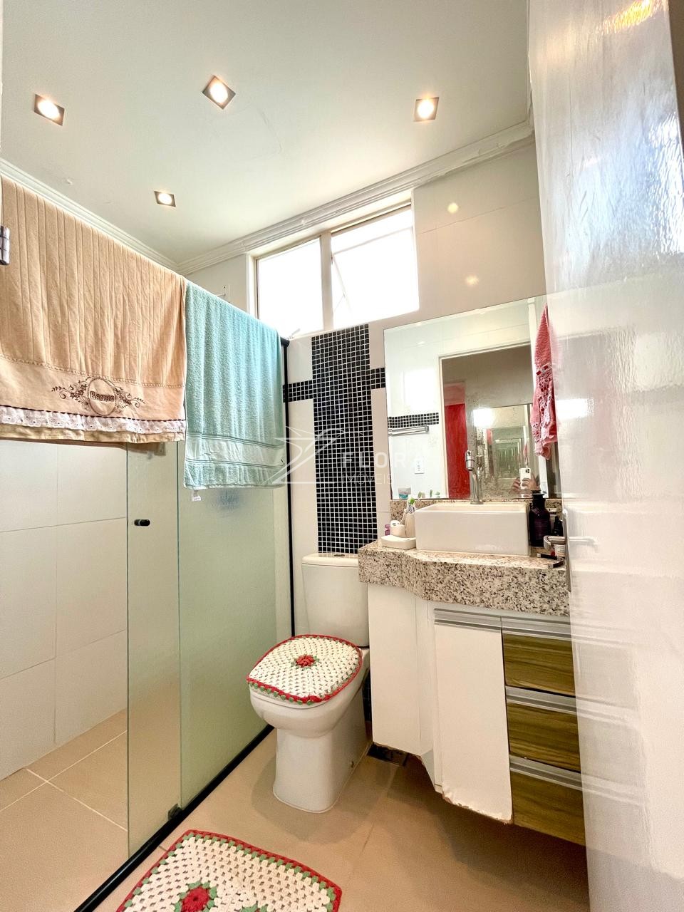 Banheiro social com box blindex, gabinete, espelho e iluminação também com spots