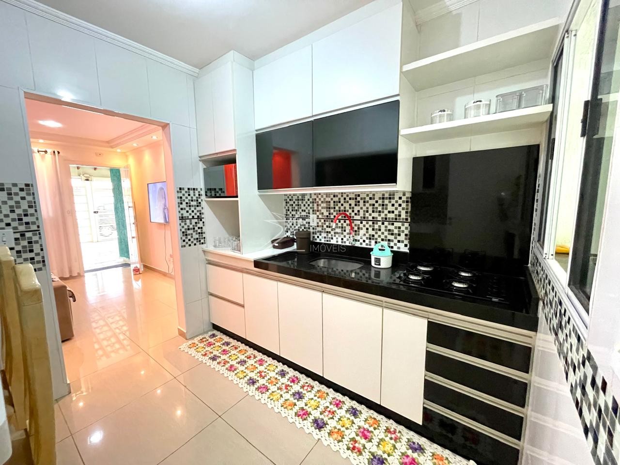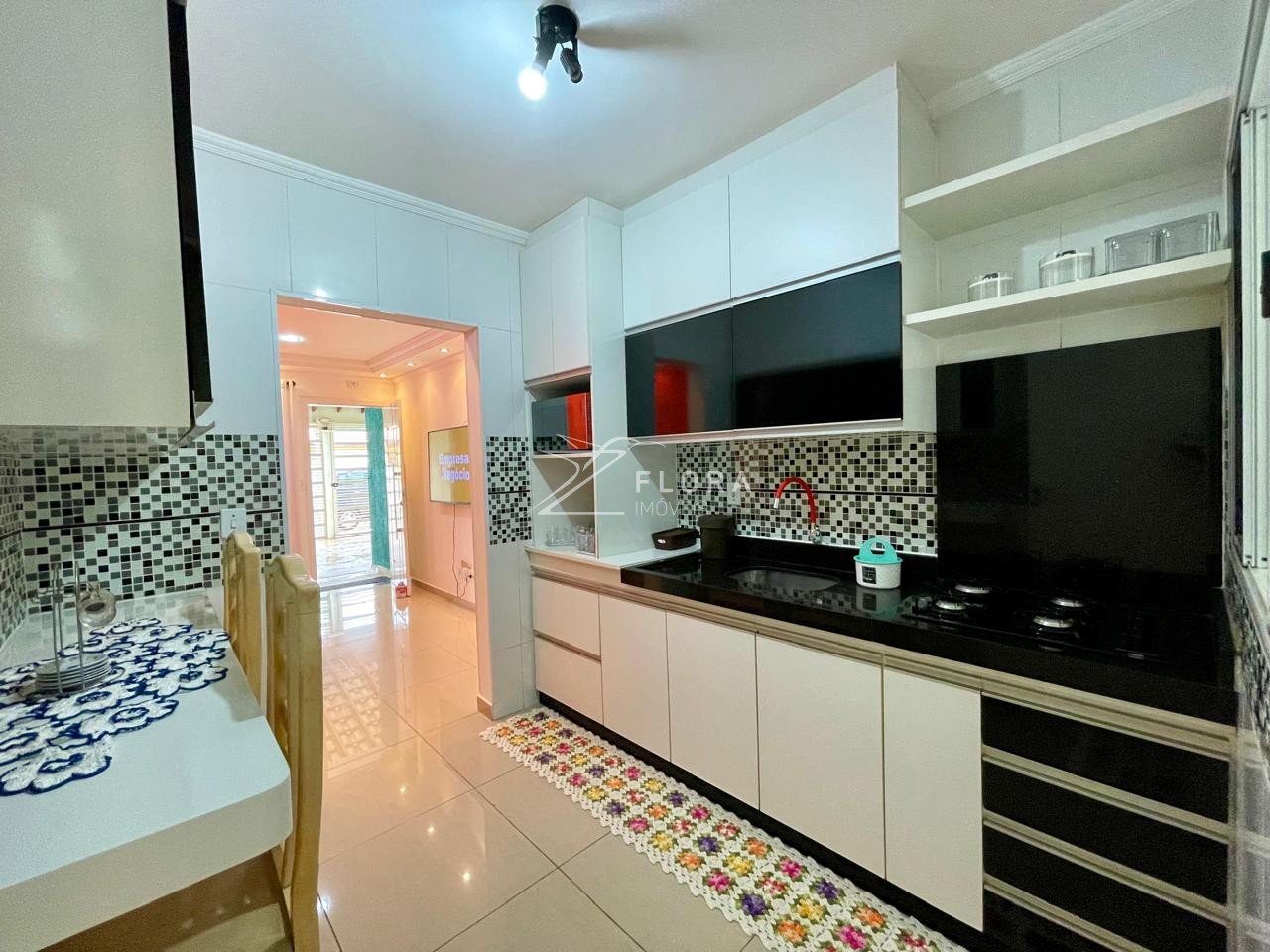 Cozinha com armários planejados, balcão para refeições e fogão cooktop