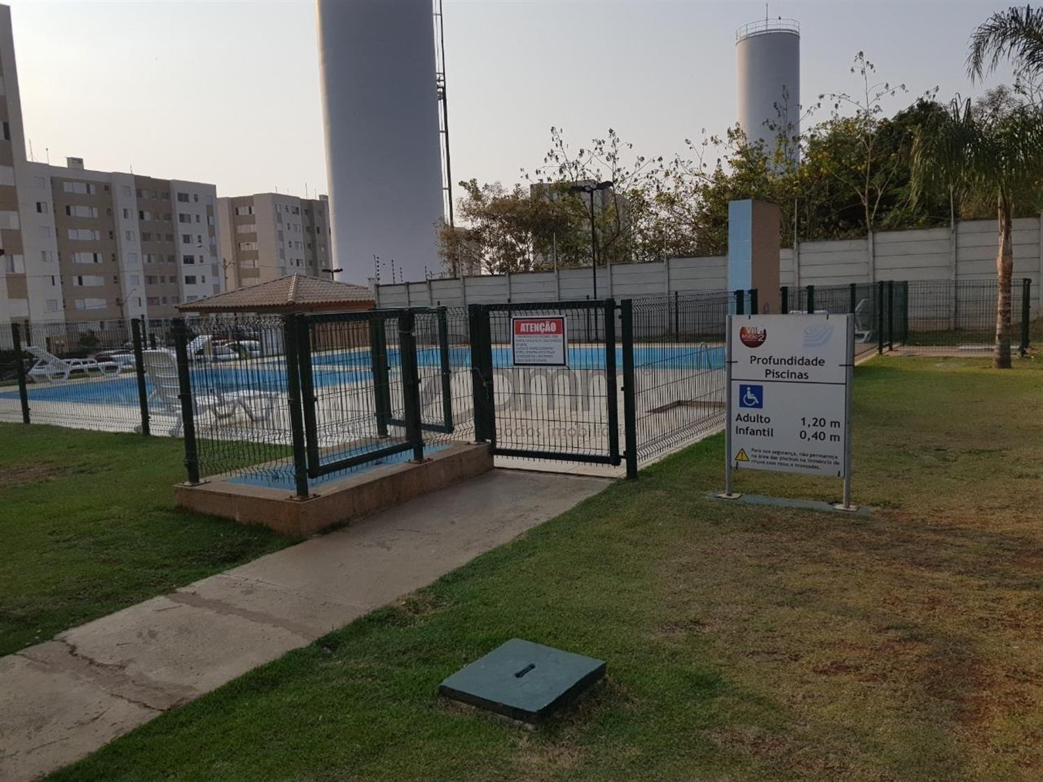 Lazer com quadra poliesportiva, salão de festas e piscina.