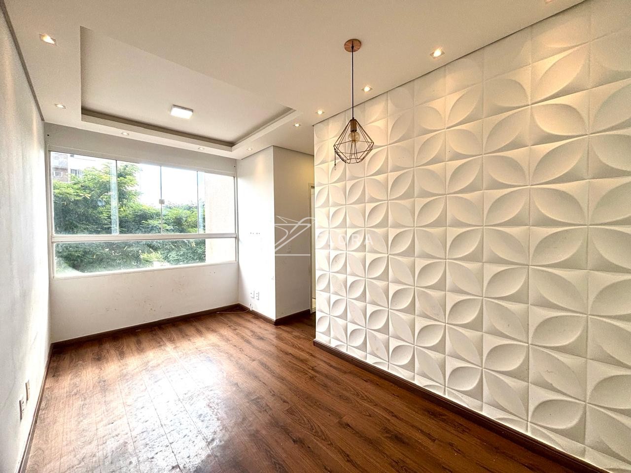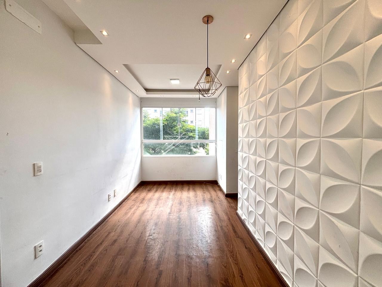 ✅ *Sala elegante, com **lustre pendente, parede 3D e uma janela ampla e maravilhosa*