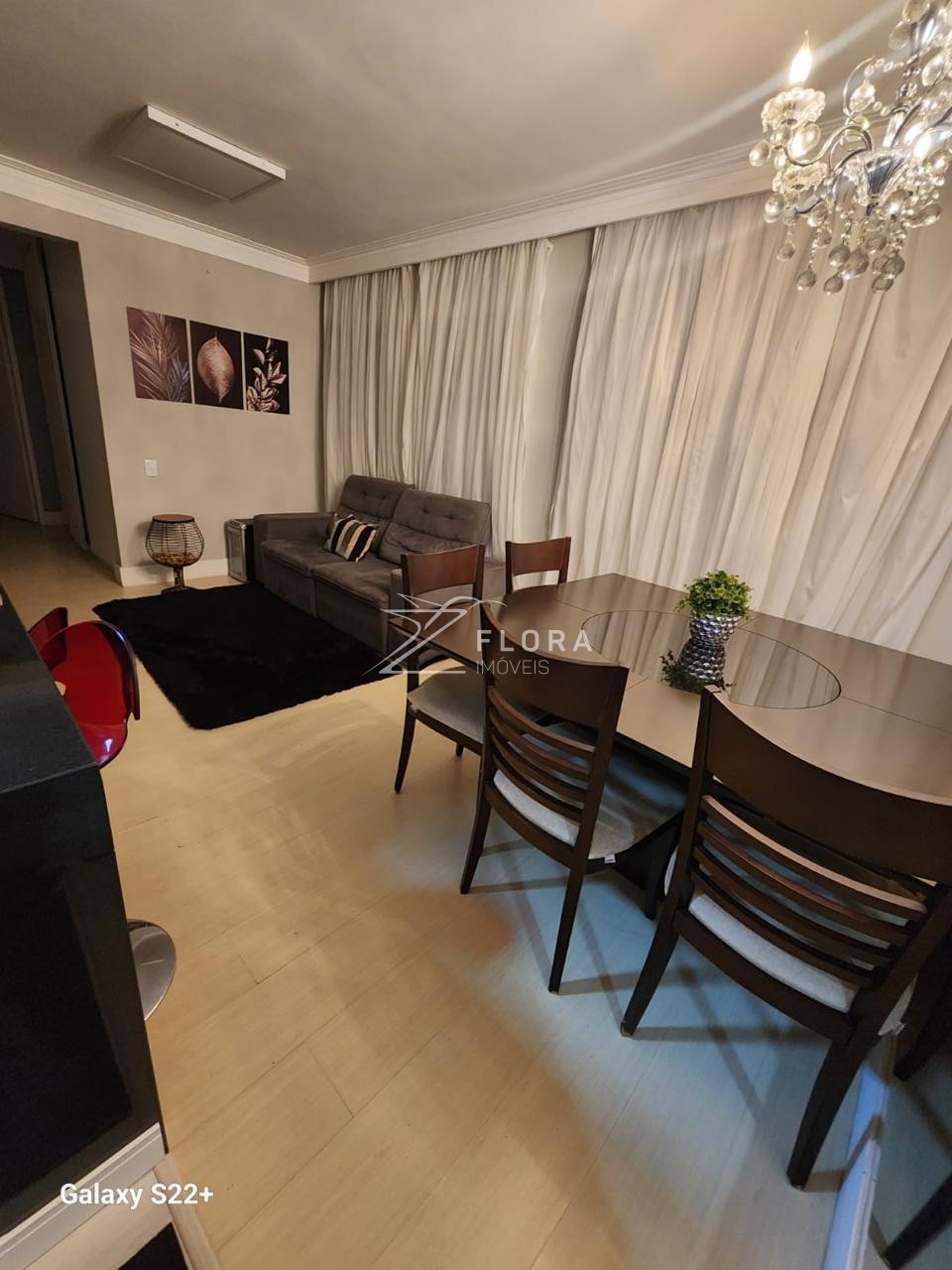 Sala ampla com dois ambientes (jantar e TV), equipada com cortineiro sob medida e planejados na área da TV.