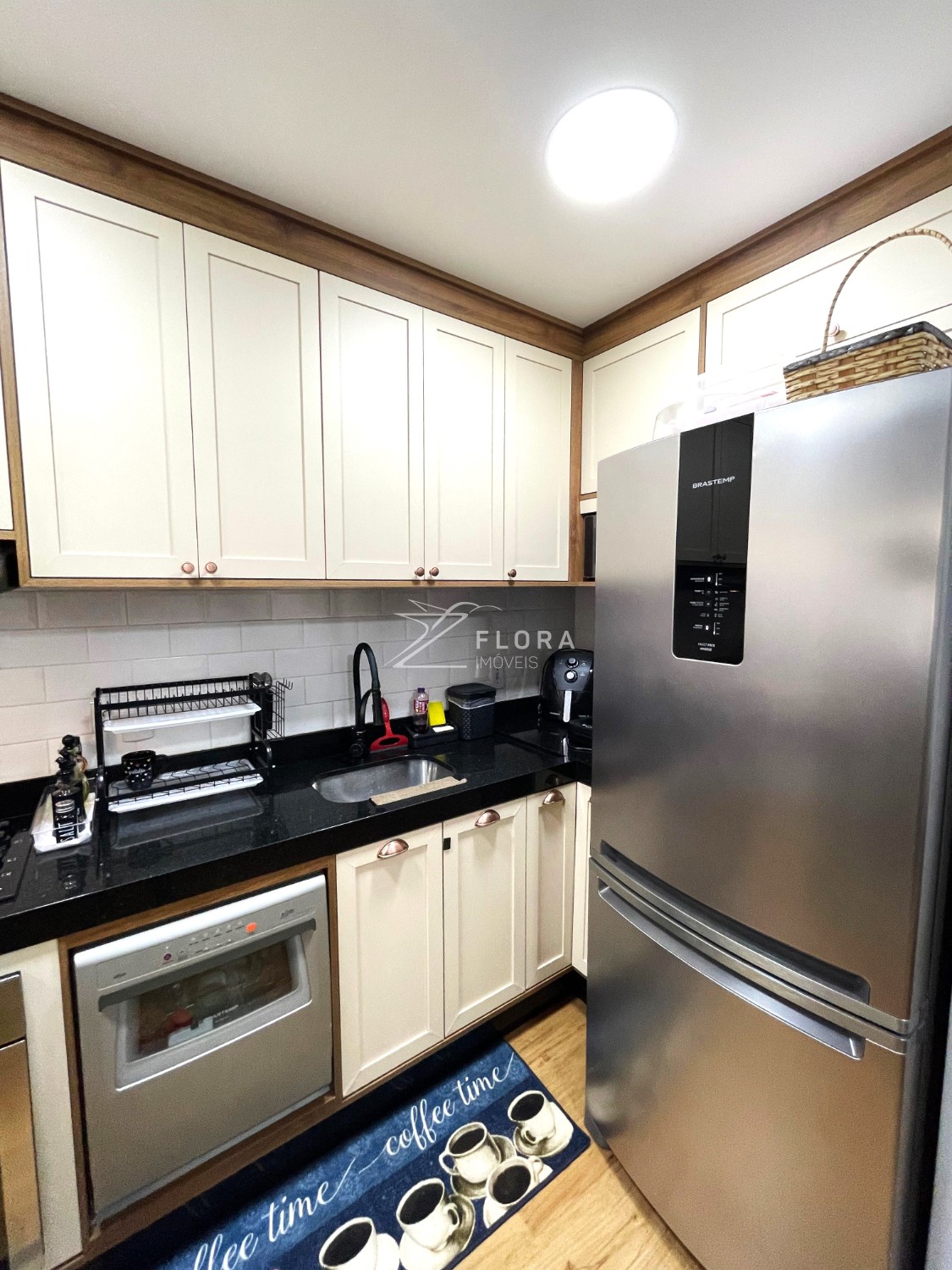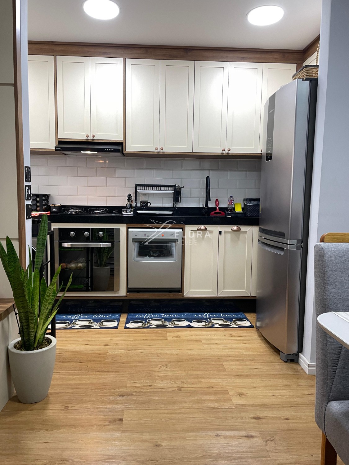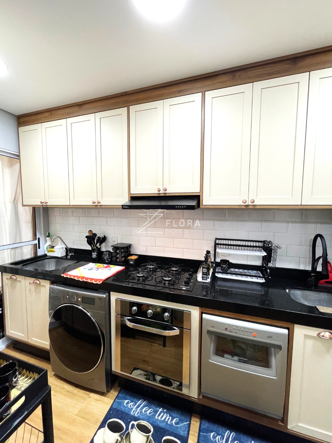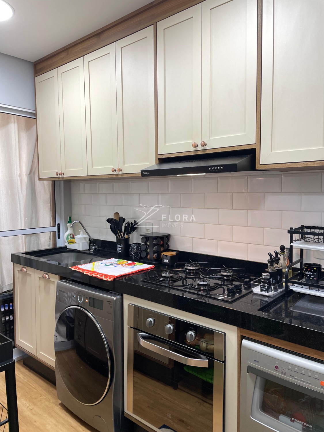 Cozinha planejada: Armários com acabamento refinado, fogão cooktop, exaustor e forno embutido. Espaço adaptado para lava-louças. A área de serviço integrada é charmosa e já preparada para máquina lava e seca.