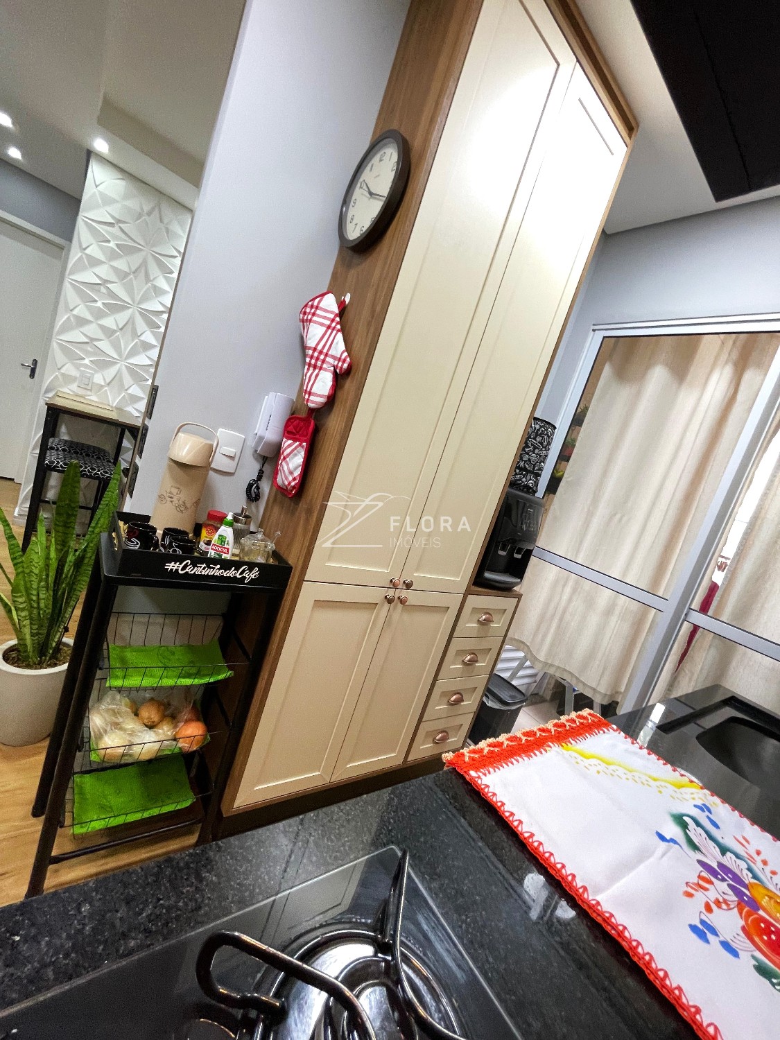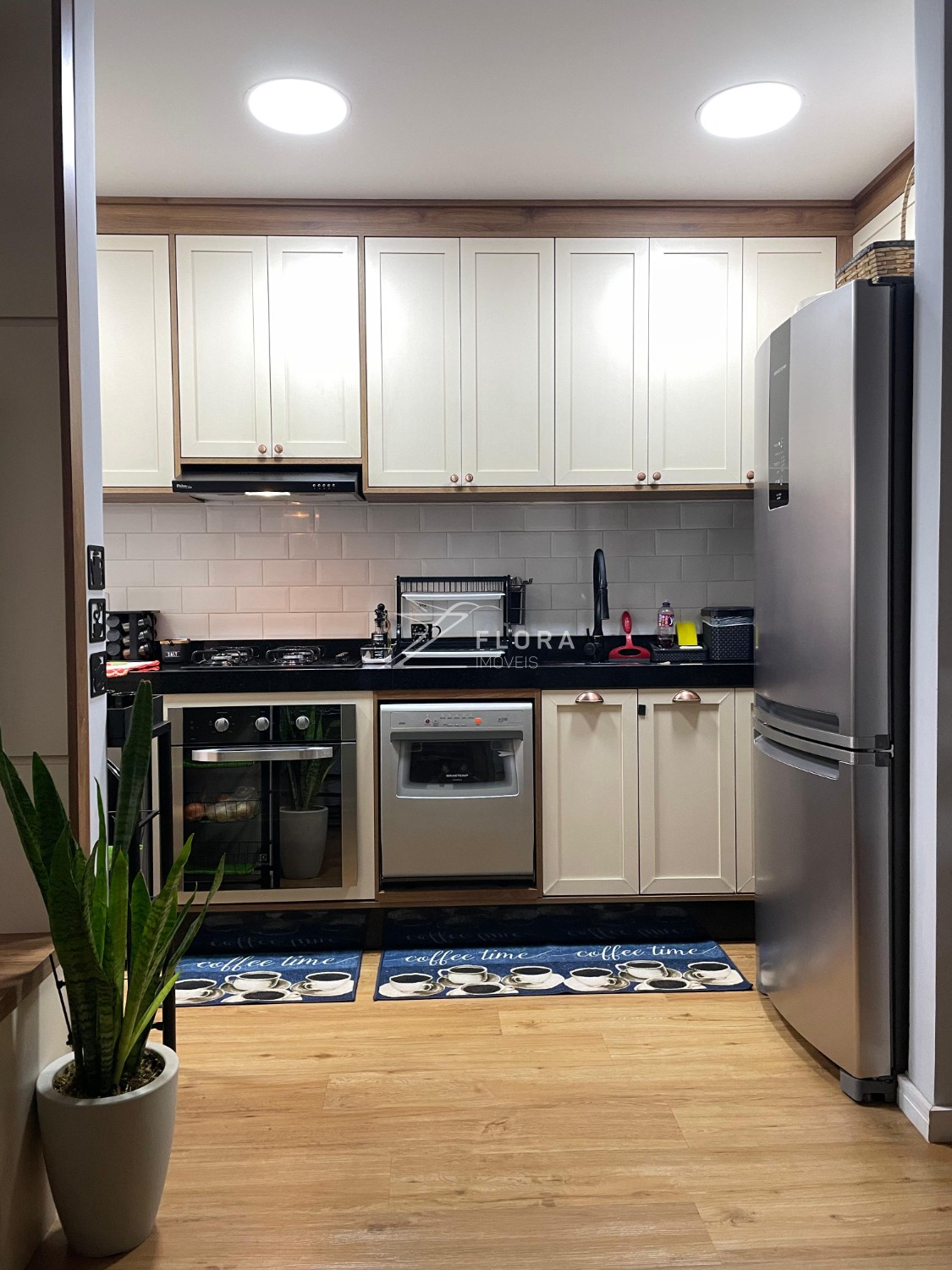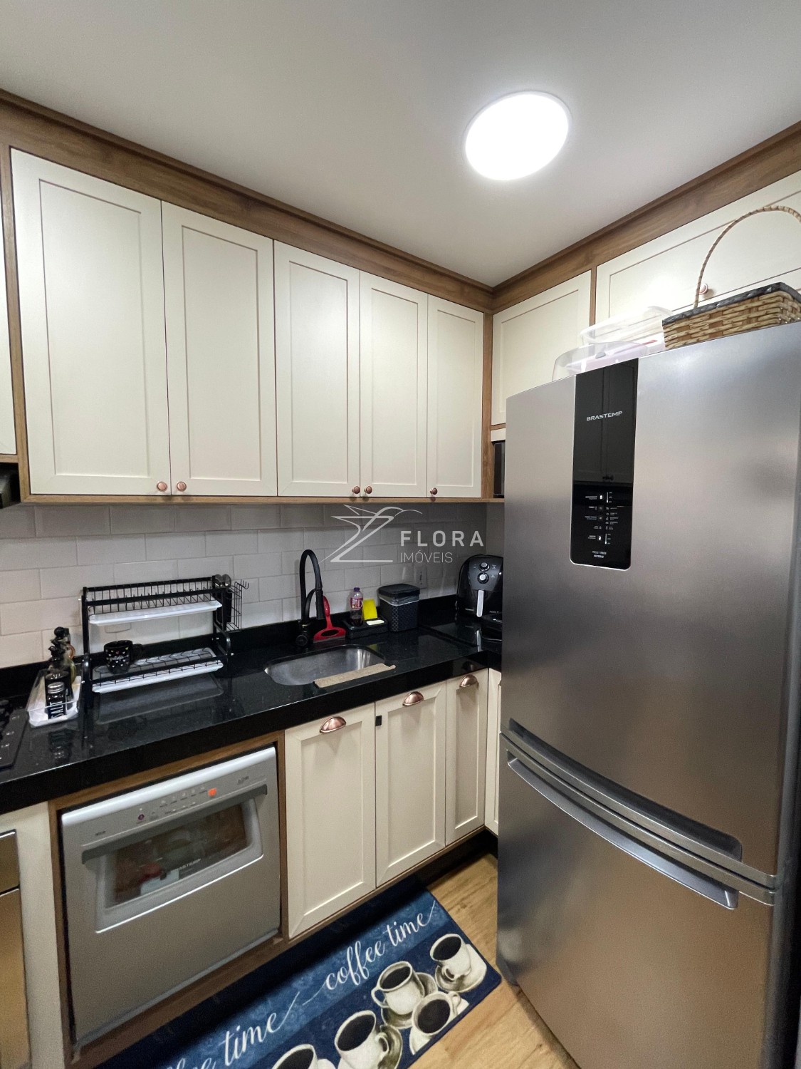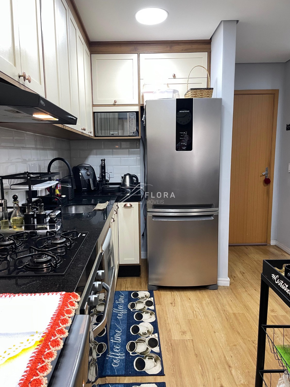 Cozinha planejada: Armários com acabamento refinado, fogão cooktop, exaustor e forno embutido. Espaço adaptado para lava-louças. A área de serviço integrada é charmosa e já preparada para máquina lava e seca.