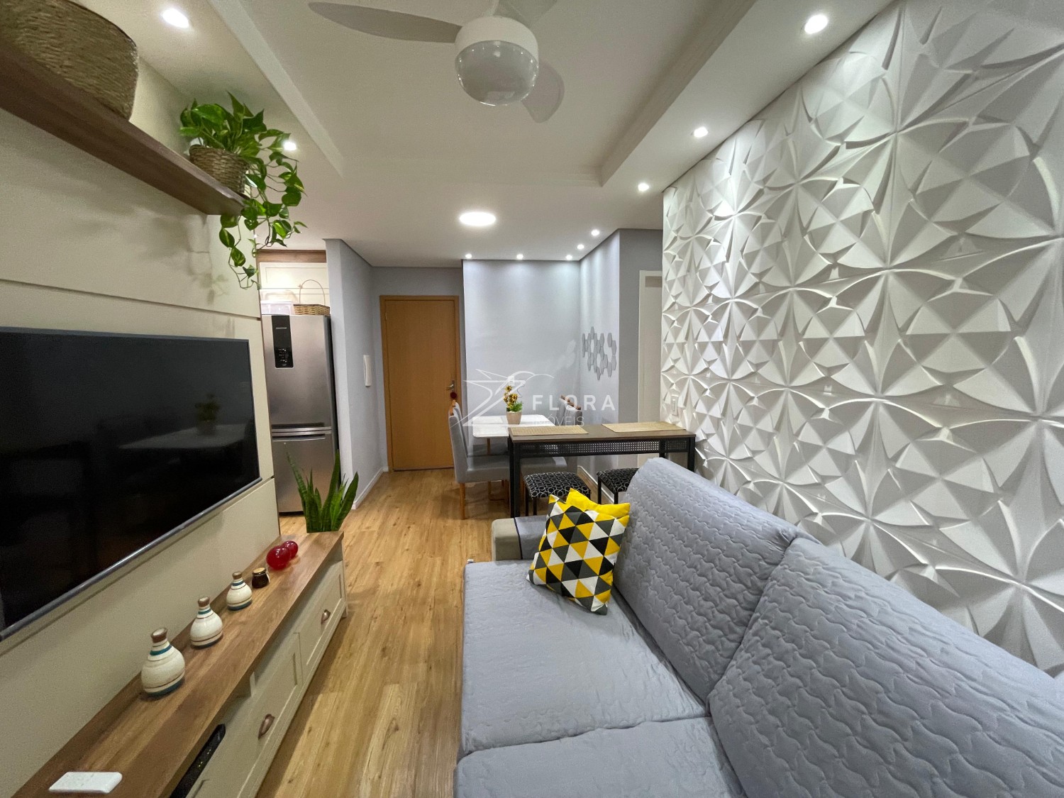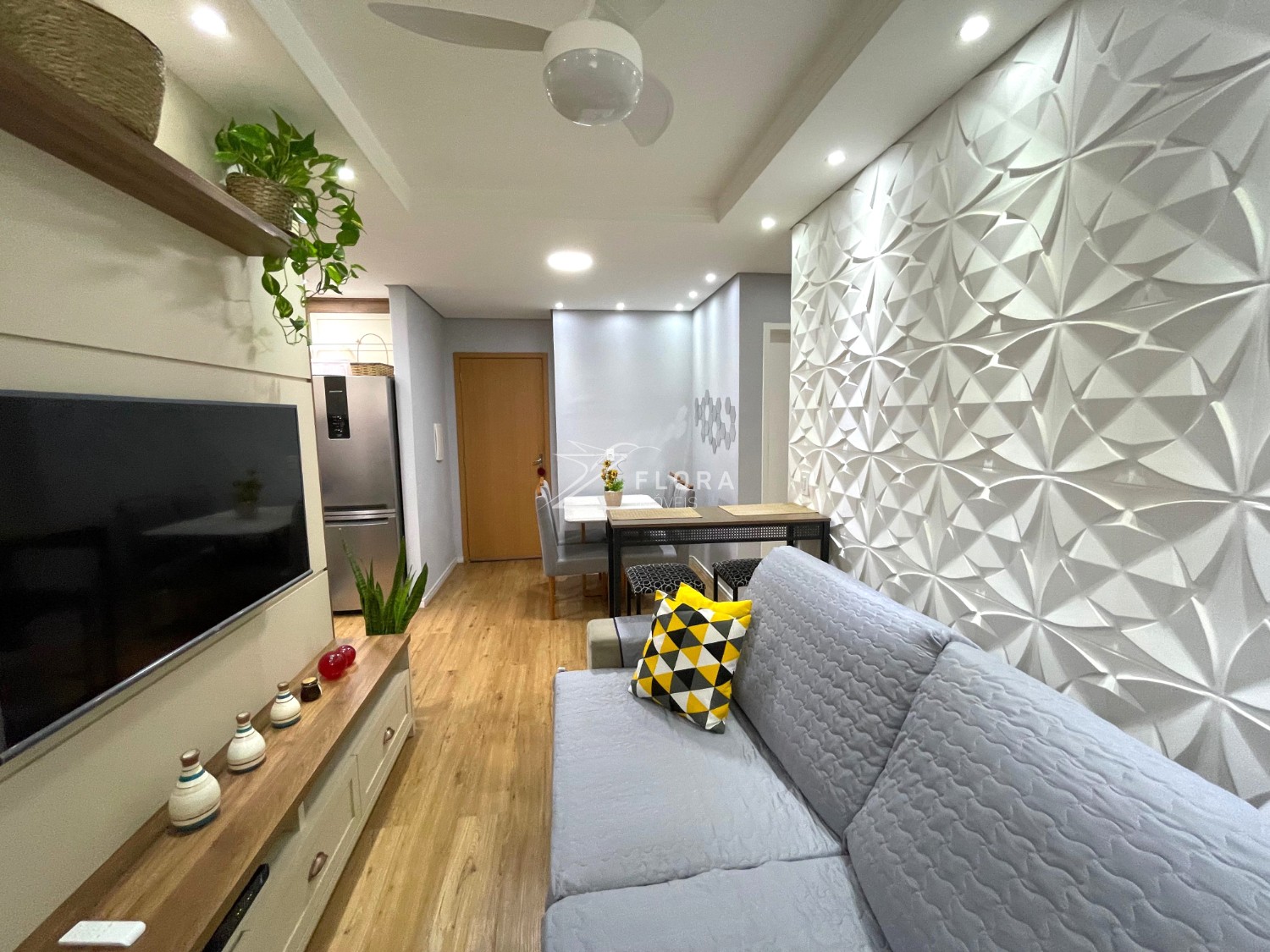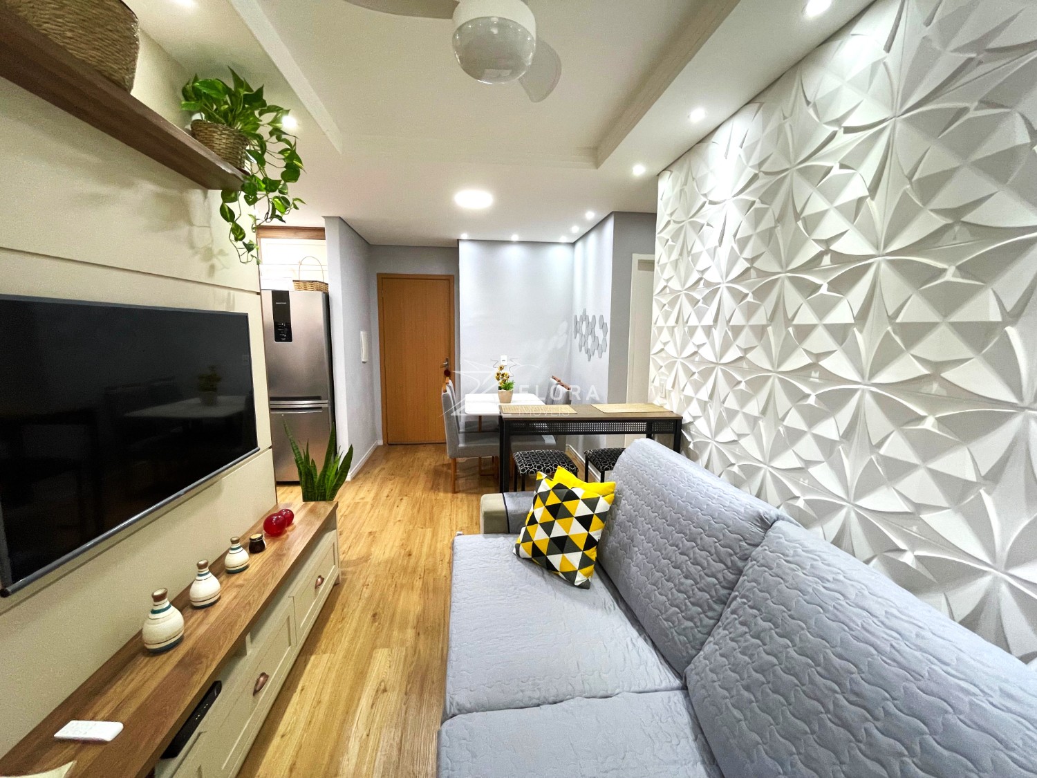 Sala em dois ambientes: Espaço acolhedor com painel planejado para TV, parede com revestimento 3D e iluminação em LED embutida no gesso tabicado, criando um ambiente moderno e elegante. Ventilador de teto instalado. Área de jantar com espaço ideal para mesa de 4 lugares.