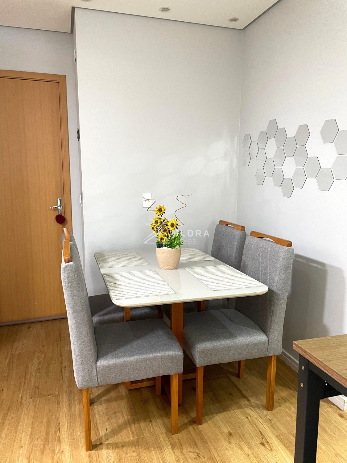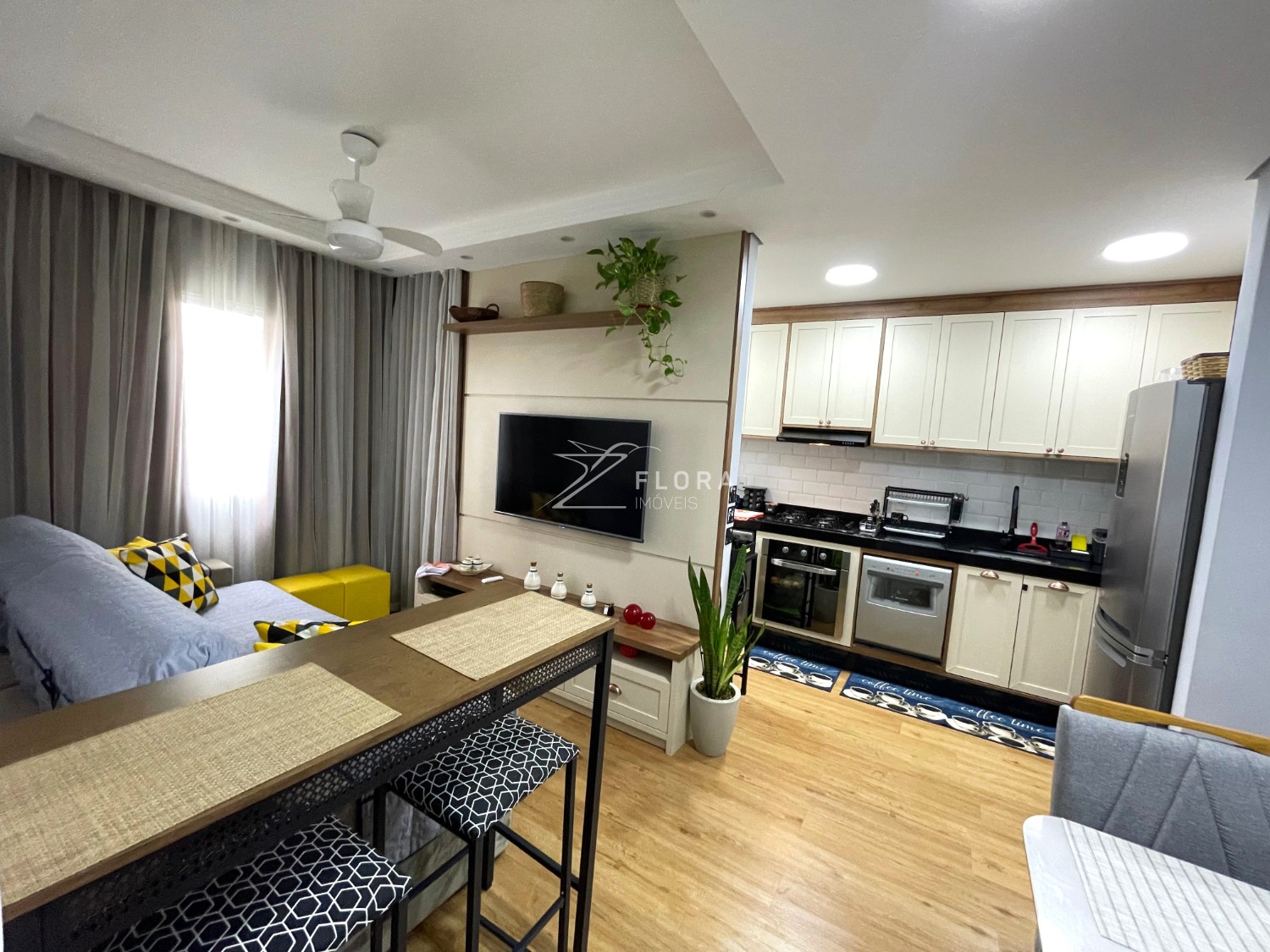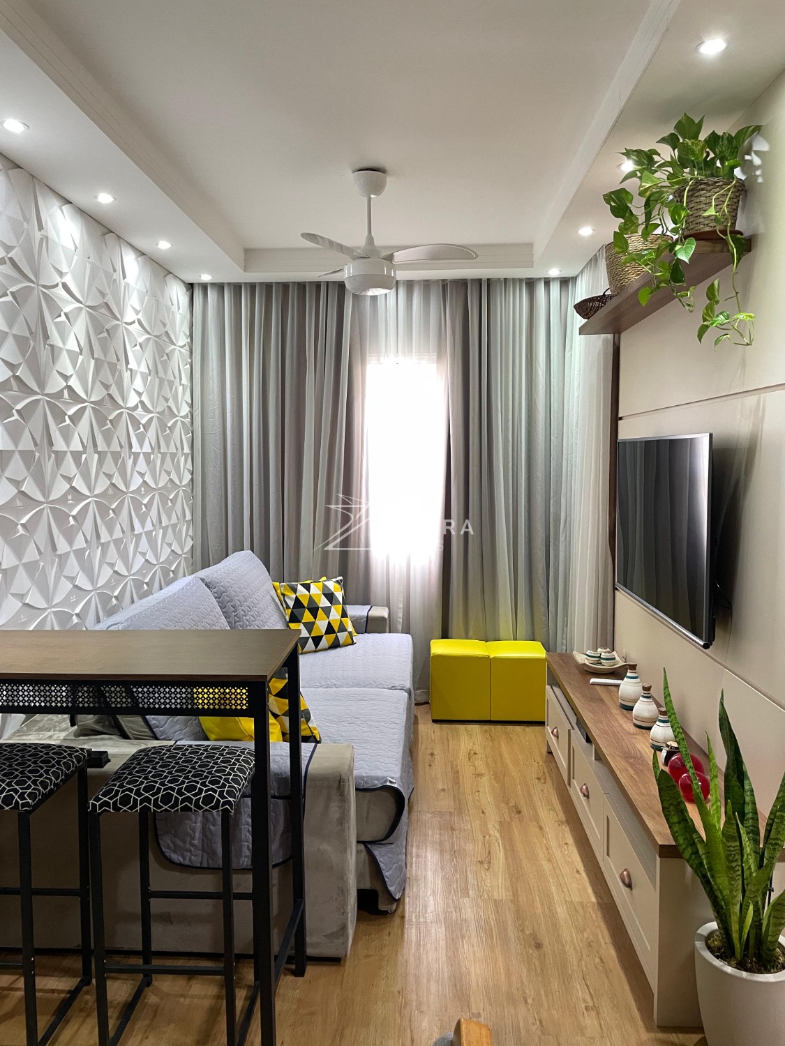 Sala em dois ambientes: Espaço acolhedor com painel planejado para TV, parede com revestimento 3D e iluminação em LED embutida no gesso tabicado, criando um ambiente moderno e elegante. Ventilador de teto instalado. Área de jantar com espaço ideal para mesa de 4 lugares.