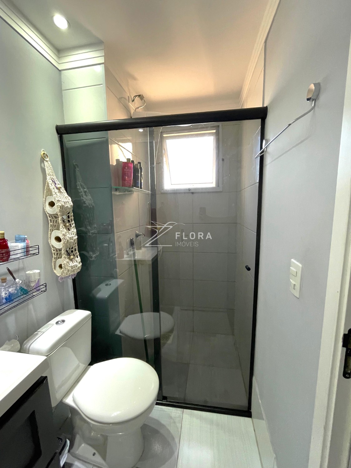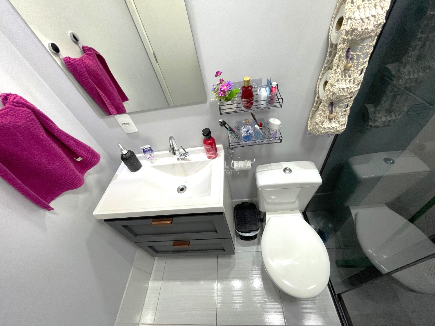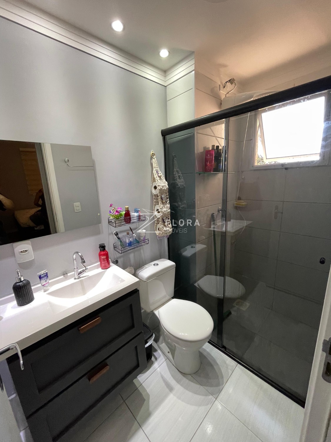 Banheiro completo: Gabinete de pia, espelho e box em vidro temperado (blindex).