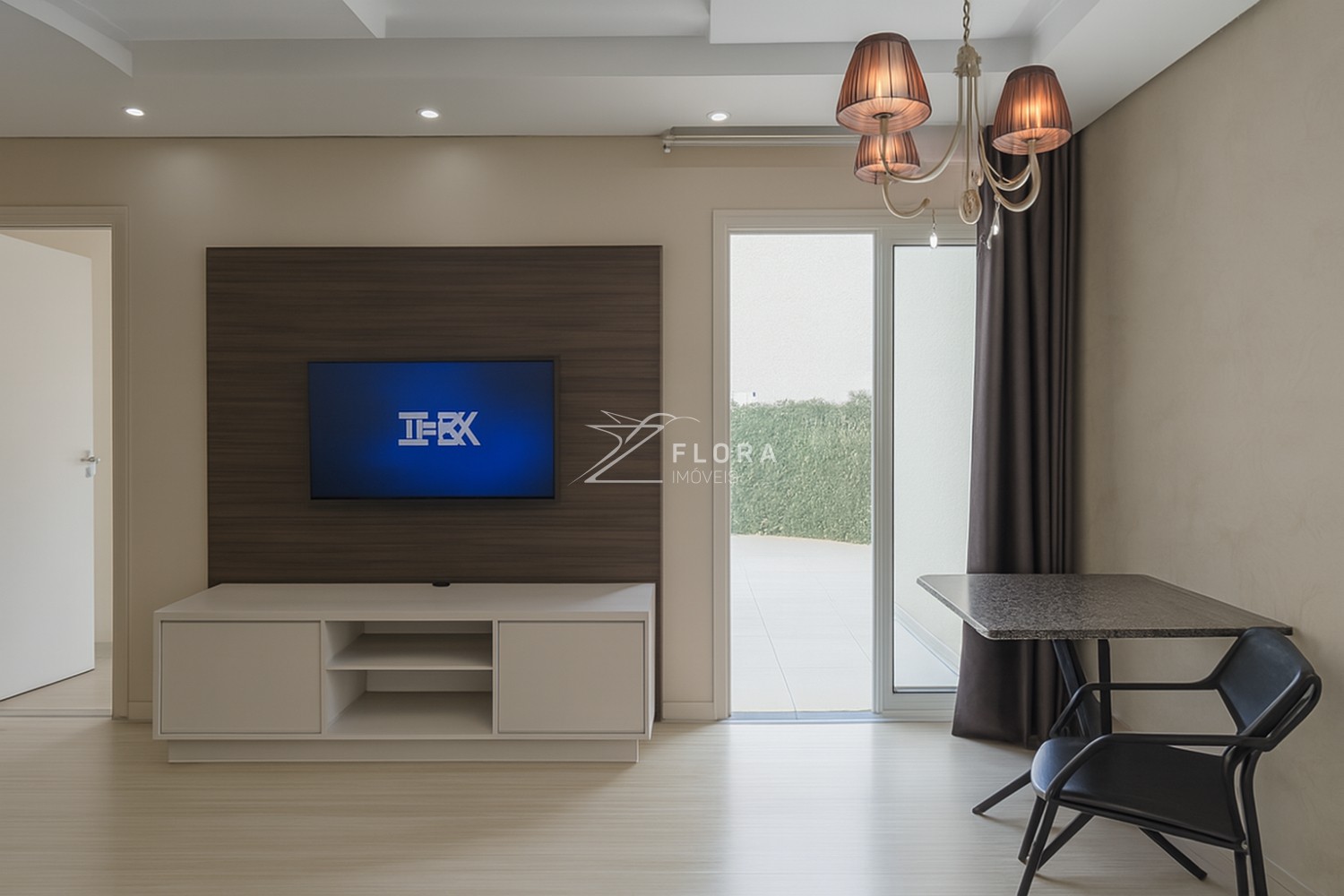 Sala ampla para dois ambientes (estar/tv e jantar) com painel de TV planejado