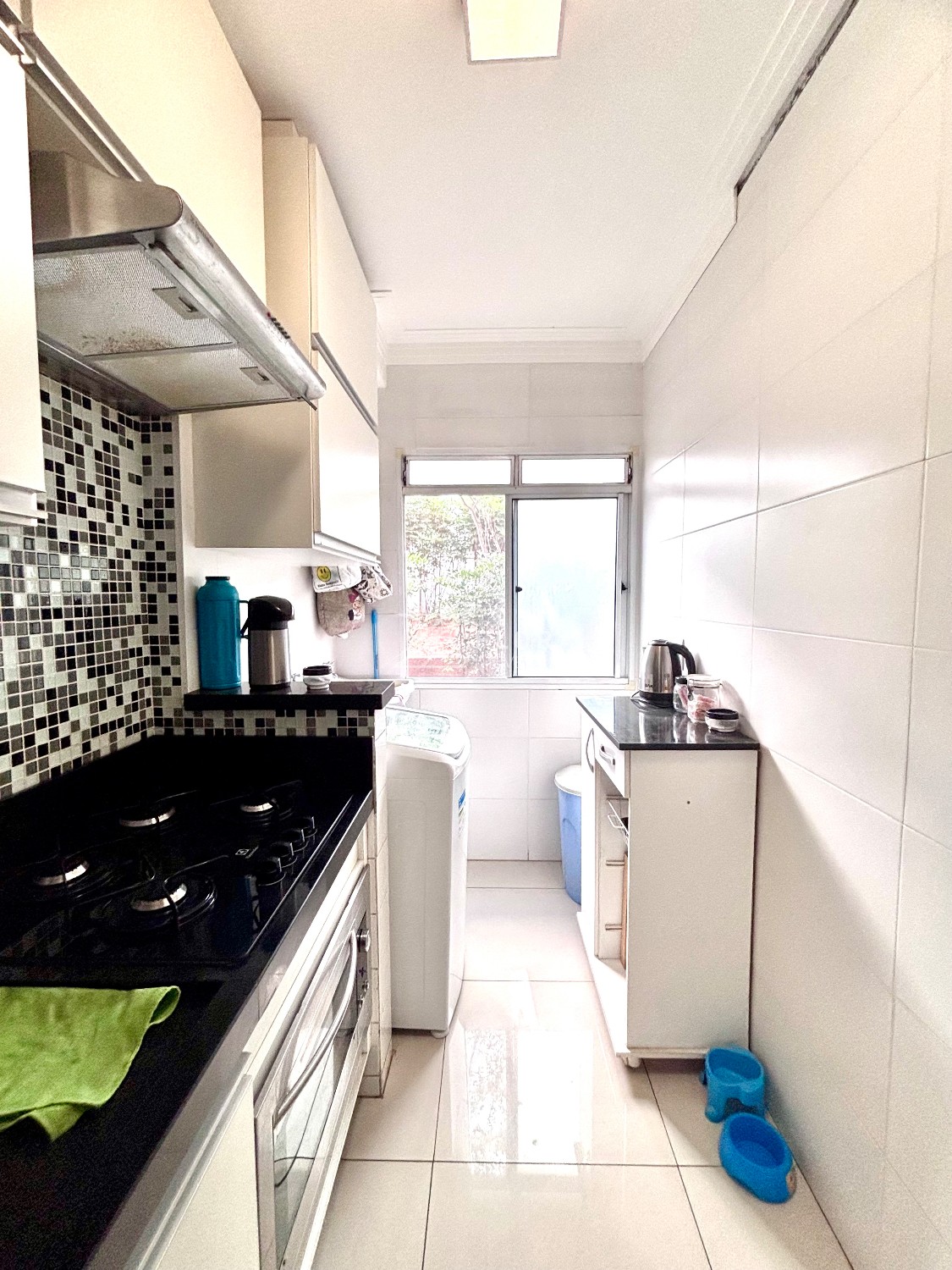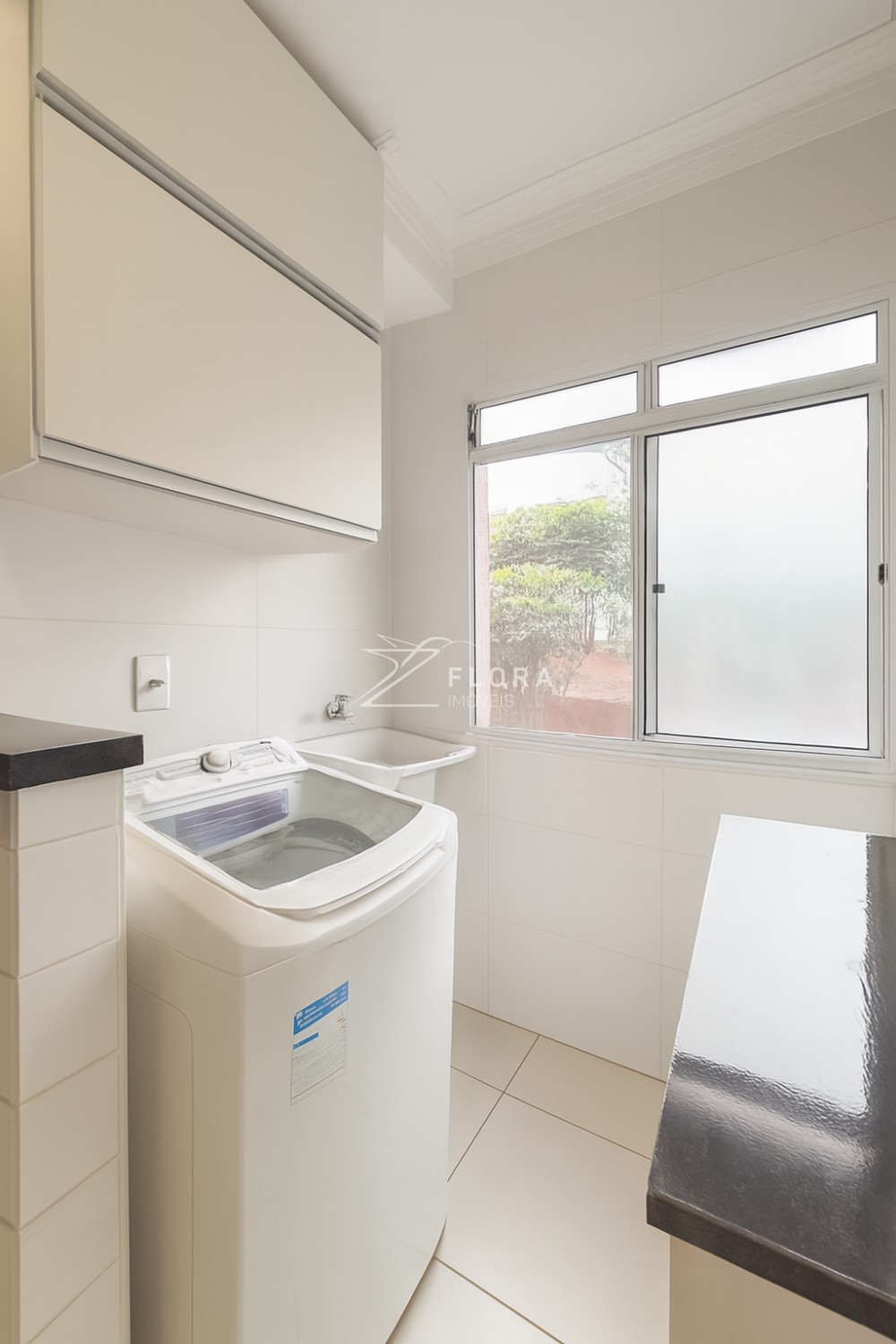Lavanderia integrada à cozinha, separada por mureta e também com armário